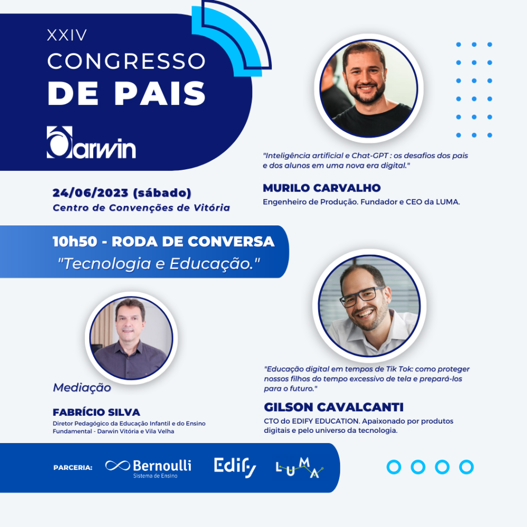 O Congresso de Pais Darwin 2024 será realizado no dia 22 de junho (sábado), no Centro de Convenções de Vitória, com credenciamento a partir das 8h. O evento é direcionado aos pais e educadores da Educação Infantil ao Ensino Médio, com a finalidade de promover um espaço de reflexão sobre questões atuais relacionadas ao cotidiano da família e da escola. Com a participação de palestrantes de renome nacional, este evento possibilita a troca de experiências entre os participantes, além do aprofundamento de importantes reflexões que permeiam as instituições educativas básicas.